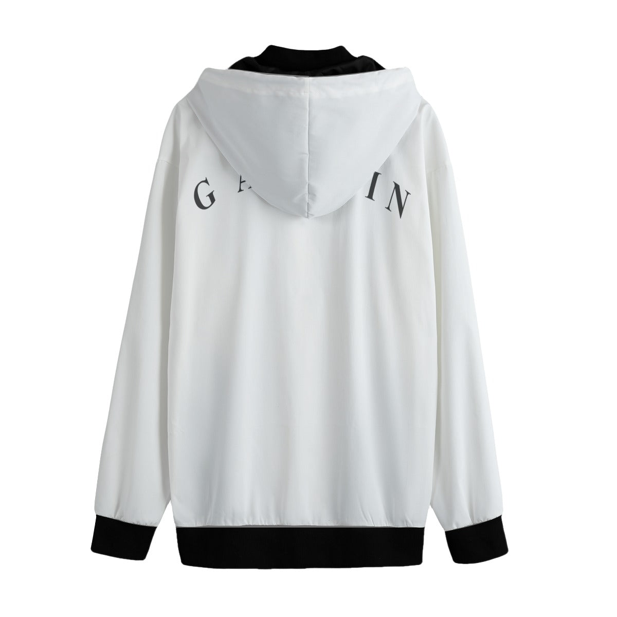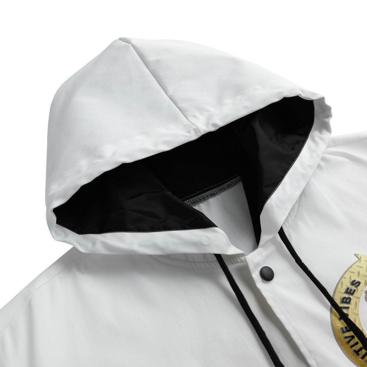 - Button closure, black rib cuffs and hem.