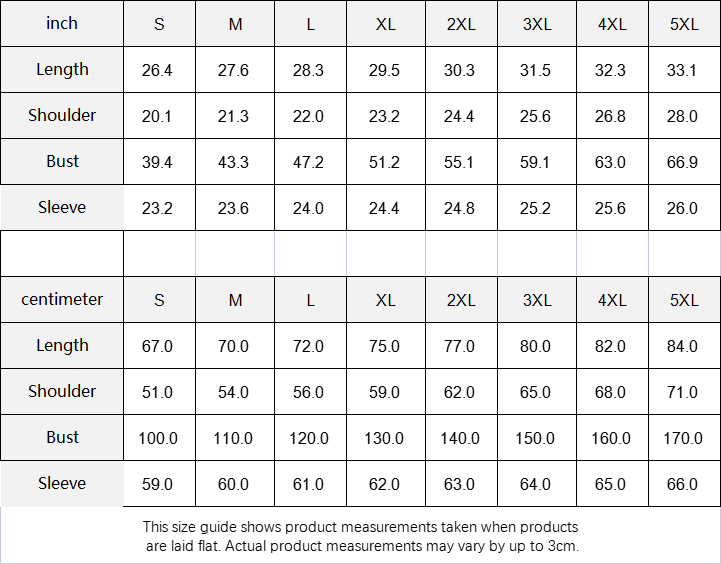 Centimeter | S | M | L | XL | 2XL | 3XL | 4XL | 5XL |