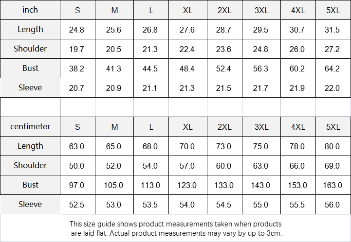 Centimeter | S | M | L | XL | 2XL | 3XL | 4XL | 5XL |